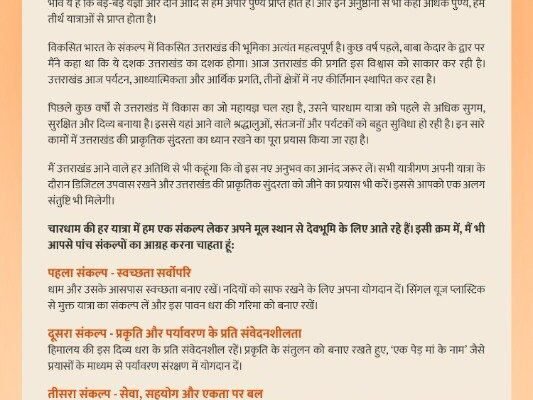 *प्रधानमंत्री नरेंद्र मोदी ने चारधाम यात्रा के लिए प्रेषित की शुभकामनाएं* *डिजिटल उपवास पर रहते हुए, उत्तराखंड की प्राकृतिक सुंदरता का आनंद लें तीर्थयात्री* *प्रधानमंत्री ने उत्तराखंड आने वाले तीर्थयात्रियों से पांच संकल्प अपनाने की अपील की* प्रधानमंत्री नरेंद्र मोदी ने चारधाम यात्रा शुरु होने पर देशवासियों को शुभकामना संदेश देते हुए, उत्तराखंड आने वाले…