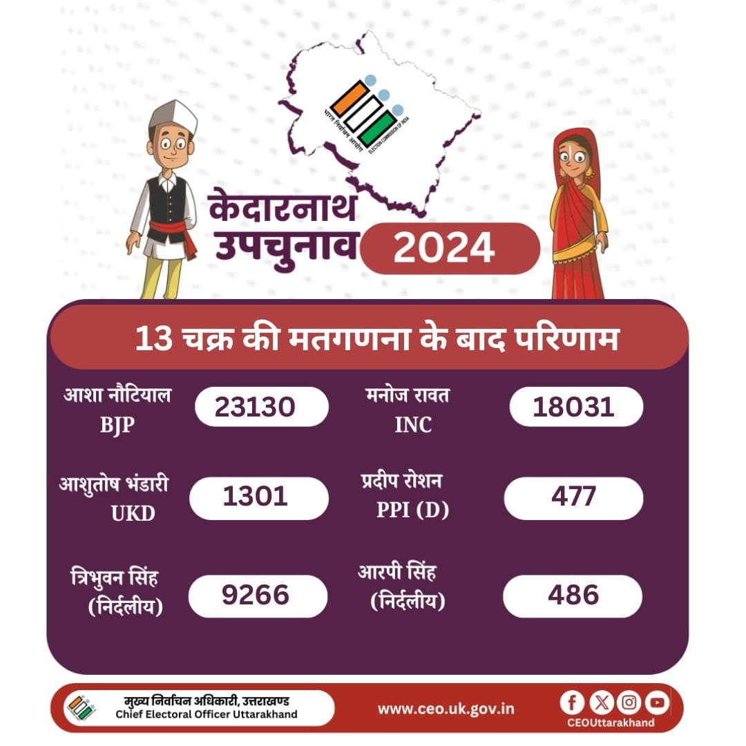 उत्तराखंडभाजपा ने जीता केदारनाथ उपचुनाव का रण ……….. UK1 NewsNovember 23, 2024November 23, 202401 mins ब्रेकिंग केदारनाथभाजपा ने जीता केदारनाथ उपचुनाव का रण…5099 वोटों से भाजपा प्रत्याशी आशा नौटियाल की जीतआशा नौटियाल को मिले 23130 वोटकांग्रेस प्रत्याशी मनोज रावत रहे दूसरे स्थान परमनोज रावत को मिले 18031 वोट Post navigationPrevious: खेल मंत्री रेखा आर्या ने ख़ुद राफ्टिंग कर राष्ट्रीय खेलों की तैयारी का किया निरीक्षण…………..Next: प्रदेश कार्यालय में जश्न का माहौल …………Leave a Reply Cancel replyYour email address will not be published. Required fields are marked *Comment *Name * Email * Website Save my name, email, and website in this browser for the next time I comment.
