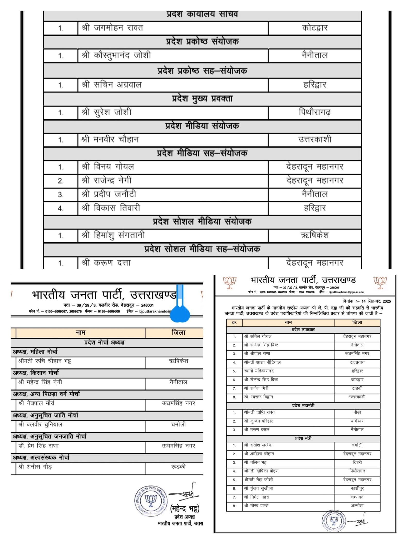 वहीं प्रदेश उपाध्यक्ष के पद पर 8, प्रदेश मंत्री के पद पर 8 लोगों को नियुक्ति दी गयी है। पुनीत मित्तल प्रदेश कोषाध्यक्ष तथा मनवीर सिंह चौहान को तीसरी बार मीडिया प्रभारी बनाया गया है। रुचि भट्ट को महिला मोर्चा का अध्यक्ष तथा अन्य मोर्चो मे भी नियुक्ति की गयी है।