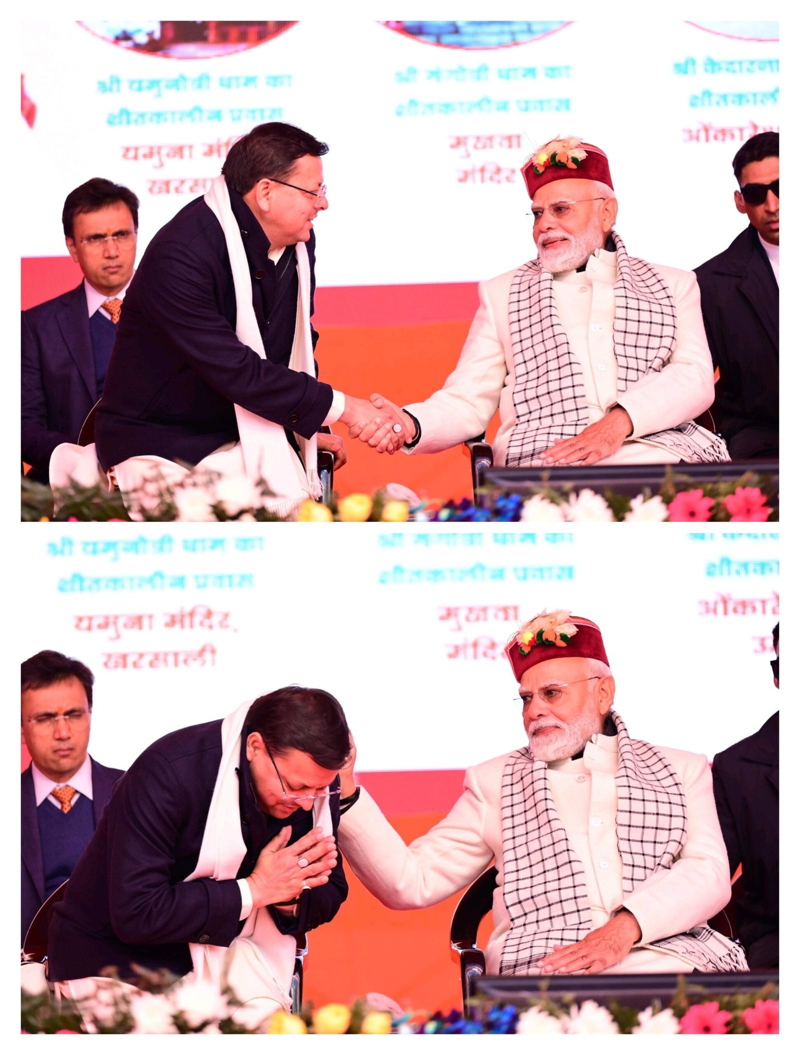 शीतकालीन यात्रा पर आए प्रधानमंत्री नरेंद्र मोदी के साथ मुख्यमंत्री पुष्कर सिंह धामी की शानदार बाॅंन्डिग गुरूवार को भी दिखी। प्रधानमंत्री को जब जहां मौका मिला, वह मुख्यमंत्री को शाबासी देते, प्रोत्साहित करते हुए दिखाई दिए। भाषण खत्म कर मुख्यमंत्री जैसे ही प्रधानमंत्री के करीब पहुंचे, तो पहले तो उन्होंने गर्मजोशी से हाथ मिलाया। बाद में मुख्यमंत्री की पीठ भी थपथपा दी।