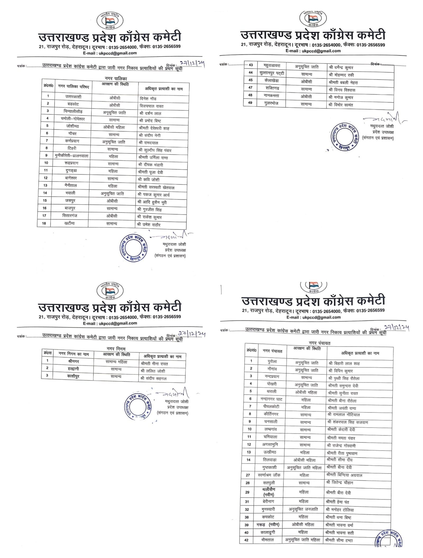 नगर निकाय चुनाव के लिए कांग्रेस की पहली लिस्ट जारी।