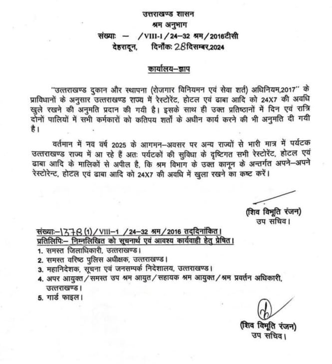 आदेश में कहा गया है कि उत्तराखंड दुकान और स्थापना (रोजगार, विनियमन एवं सेवा शर्त) अधिनियम 2017 के प्राविधानों के अनुसार उत्तराखंड राज्य में रेस्टोरेंट, होटल और ढाबा आदि को सप्ताह में सातों दिन और चौबीसों घंटे खुले रखने की अनुमति प्रदान की गई है। इसके साथ ही उक्त प्रतिष्ठानो में दिन व रात्रि में दोनों पालियों में सभी कर्मकारों को कतिपय शर्तों के अधीन कार्य करनेकी भी अनुमति दी गई है। कहा गया है कि नववर्ष के मौके पर भारी मात्रा में पर्यटक उतराखंड आ रहे हैं। होटल, रेस्टोरेंट और ढाबा मालिकों से अपील की गई है कि वह पर्यटकों की सुविधा का ध्यान रखते हुए पूरे समय अपने प्रतिष्ठान खुले रखें।
