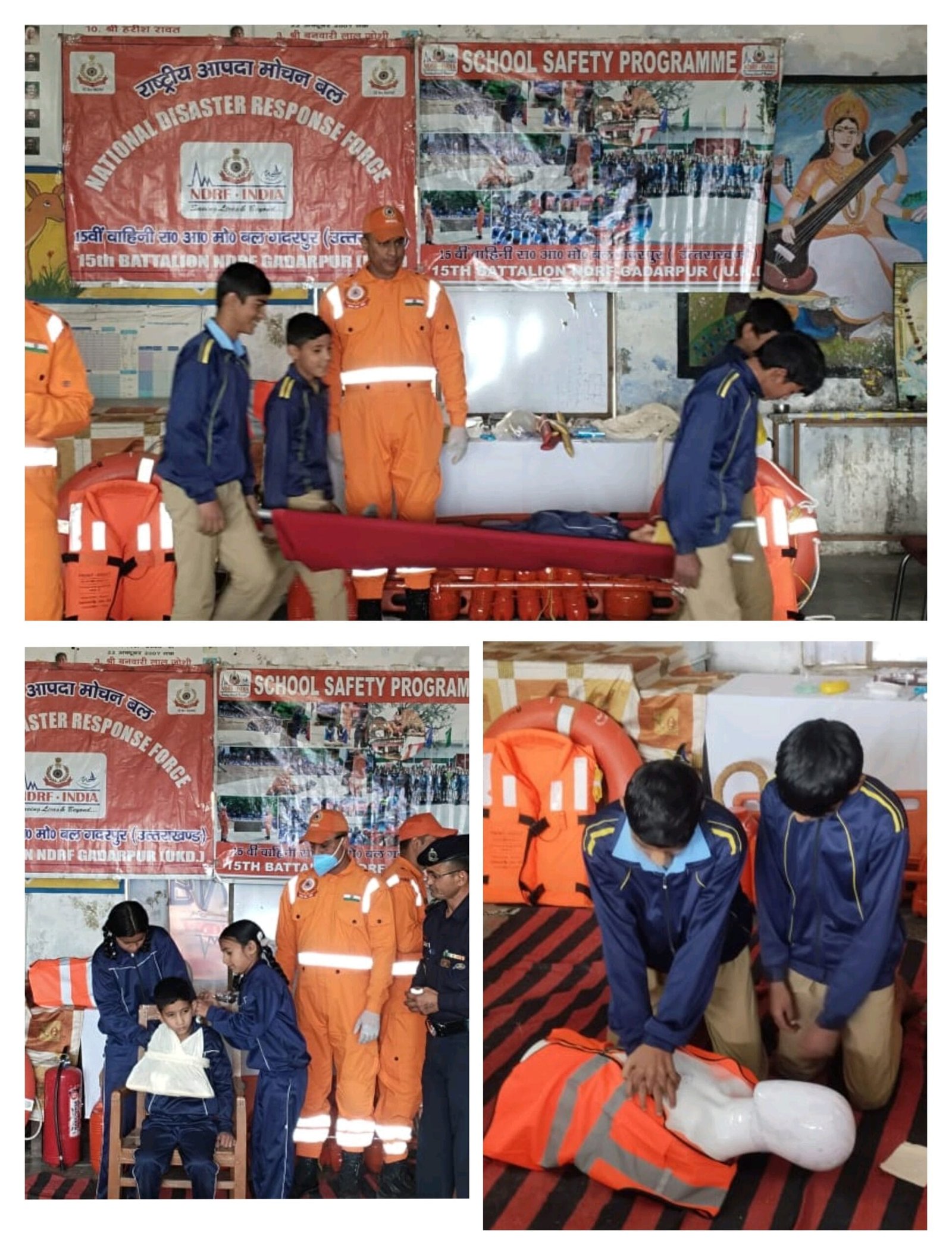 ओवरव्यू आफ एनडीआरएफ, रोल और रिस्पांसिबिलिटी आफ एन डी आर एफ, हृदय घात होने पर उपाय (CPR), गला चौक होने पर उपाय (FBAO), ब्लीडिंग कंट्रोल, इमरजेंसी/नॉन इमरजेंसी मूव, इंप्रोवाइज तरीके से स्ट्रैचर तैयार करना ,फायर एमरजैंसी, बाढ़, भूकंप के दौरान क्या करें क्या ना करें और इंप्रोवाइज फ्लोटिंग डिवाइस तथा रोप रेस्क्यू के बारे में प्रदर्शन किया गया। जिसमें स्कूल के छात्र-छात्राओं ने बढ़-चढ़कर हिस्सा लिया और भविष्य में आने वाली किसी भी प्रकार की इमरजेंसी से निपटने के लिए सीखने का प्रयास किया।