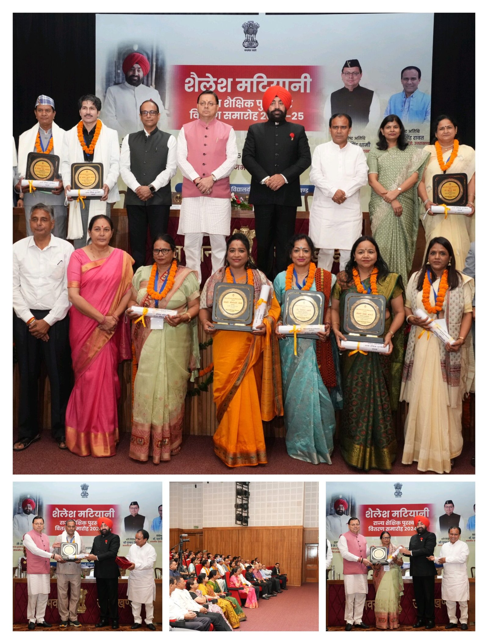 शिक्षक दिवस के अवसर पर शुक्रवार को राजभवन में ‘‘शैलेश मटियानी राज्य शैक्षिक पुरस्कार’’ सम्मान समारोह आयोजित हुआ। समारोह में राज्यपाल लेफ्टिनेंट जनरल गुरमीत सिंह (से नि), मुख्यमंत्री पुष्कर सिंह धामी और शिक्षा मंत्री डॉ. धन सिंह रावत ने वर्ष-2024 में शैलेश मटियानी राज्य शैक्षिक पुरस्कारों के लिए चयनित 16 शिक्षक एवं शिक्षिकाओं को सम्मानित किया। वर्ष-2024 में चयनित 09 प्रारम्भिक शिक्षक, 05 माध्यमिक शिक्षक, 01 शिक्षक प्रशिक्षक एवं 01 संस्कृत शिक्षक को यह सम्मान प्रदान किया गया है। (सूची संलग्न)