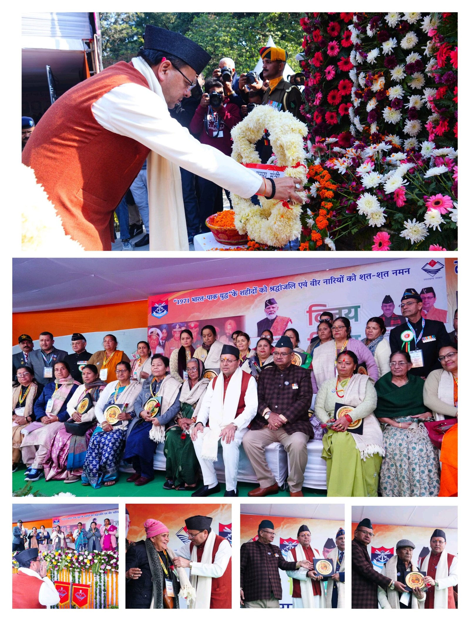 मुख्यमंत्री ने कहा कि 1971 में पाकिस्तान के लगभग 93 हजार सैनिकों ने हमारी सेना के समक्ष आत्मसमर्पण किया। उन्होंने कहा कि इस युद्ध में वीरभूमि उत्तराखंड के 248 बहादुर सपूतों ने भी अपना सर्वोच्च बलिदान दिया। हमारे प्रदेश के 74 सैनिकों को अपने अदम्य साहस और शौर्य के लिए विभिन्न वीरता पदकों से सम्मानित भी किया गया था। उन्होंने कहा कि उत्तराखंड के लगभग प्रत्येक परिवार का कोई न कोई सदस्य सेना में है। प्रधानमंत्री श्री नरेंद्र मोदी के नेतृत्व में जवानों का मनोबल बढ़ाने के साथ ही सेना को अत्याधुनिक तकनीक और हथियारों से सुसज्जित किया जा रहा है।