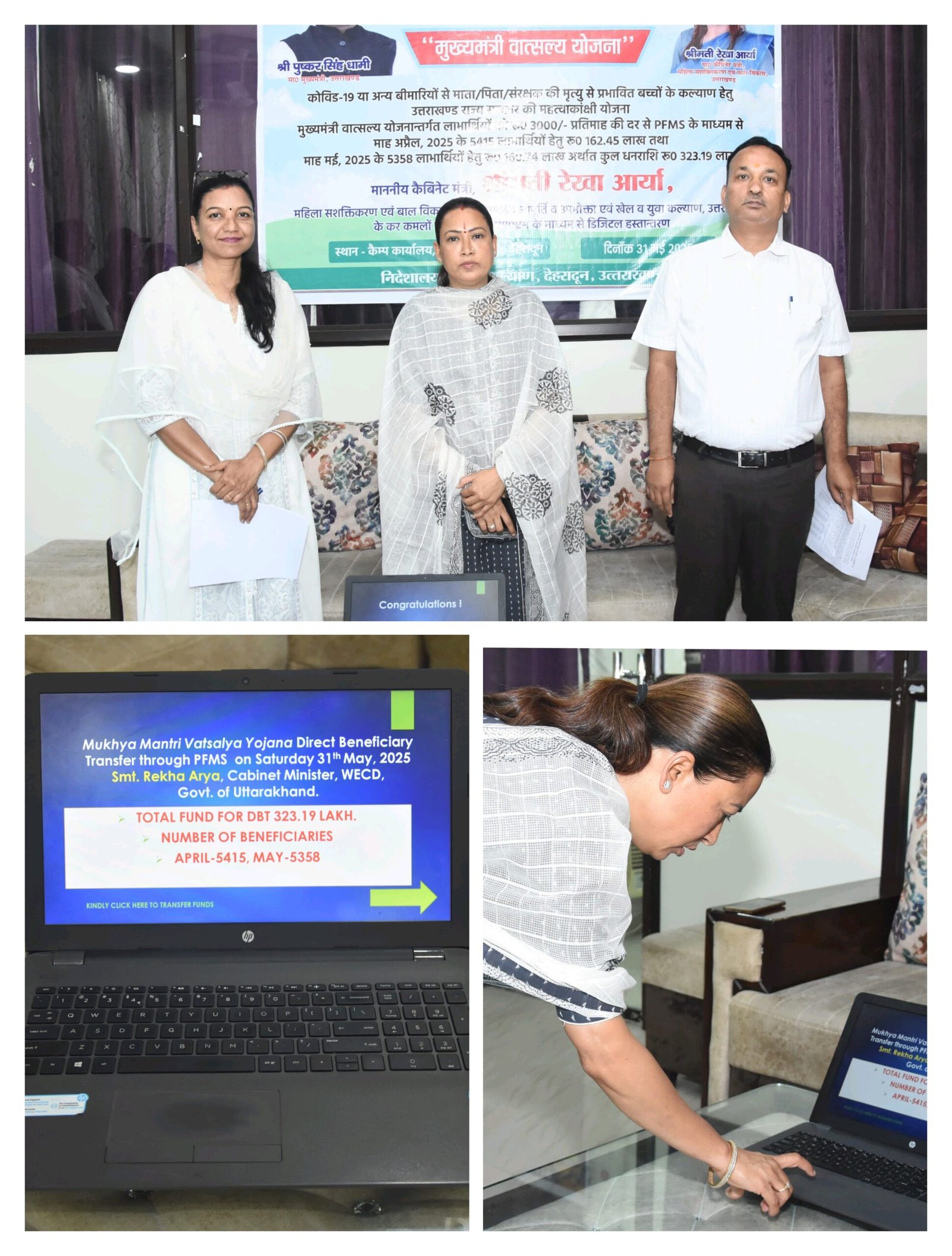 महिला सशक्तिकरण एवं बाल विकास मंत्री रेखा आर्या ने मुख्यमंत्री वात्सल्य योजना के तहत लाभार्थियों को 3 करोड़ 23 लाख रुपए से ज्यादा की धनराशि जारी की।